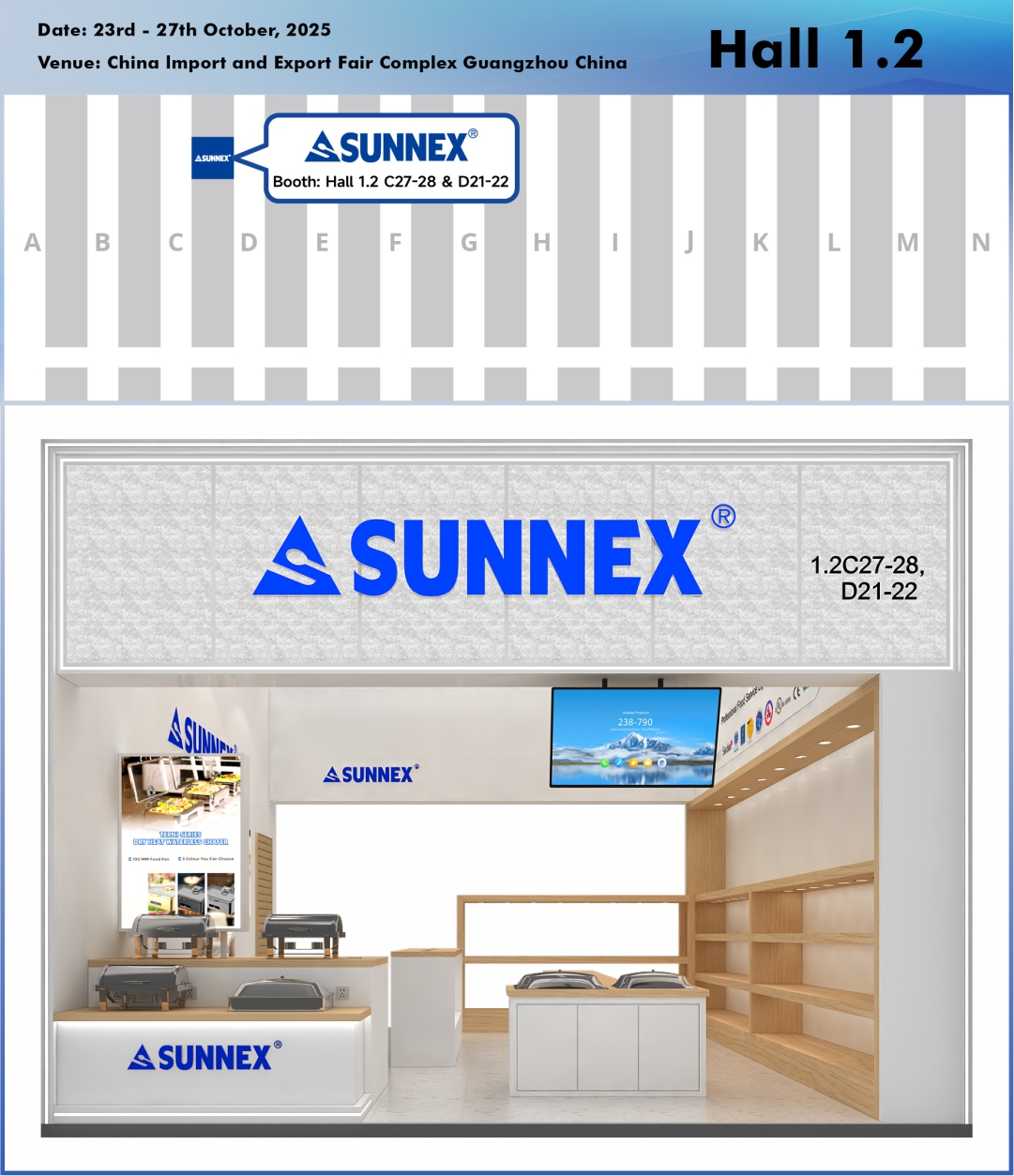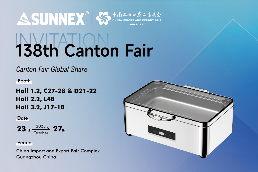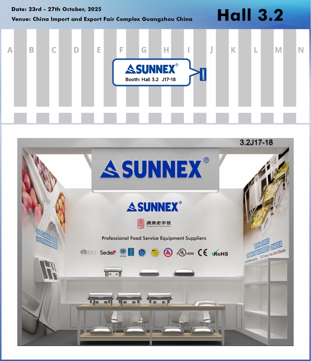 Guangzhou, Çin - 2025 - SunnEx əsr (Shenzhen), Premium Bufet qabları, Chafing yeməkləri, içki dispensatorları və məişət əşyaları, media və sənaye mütəxəssislərini 138-ci Çin İdxal və İxrac Sərgisində (Kanton Sərgisində) ziyarət etməkdən məmnundur.